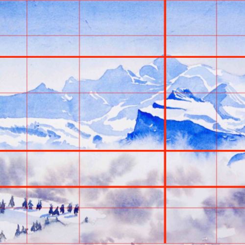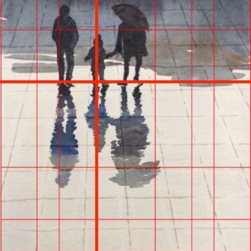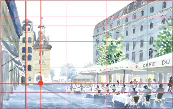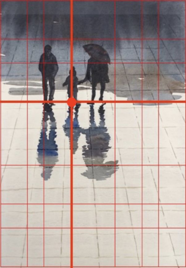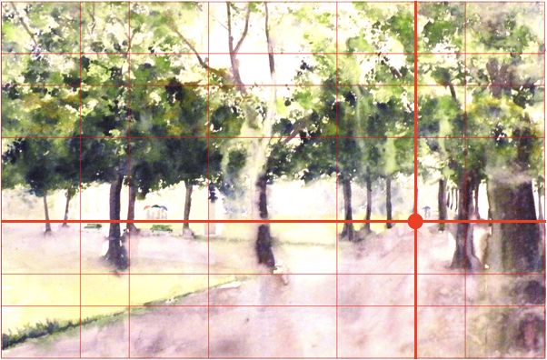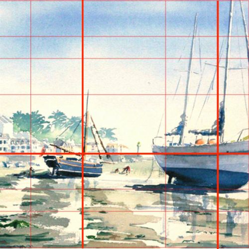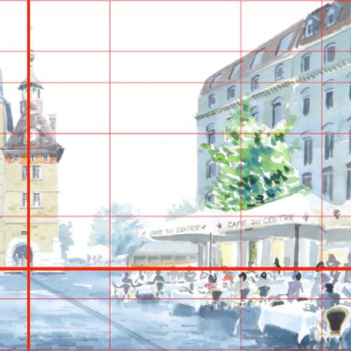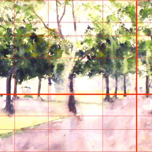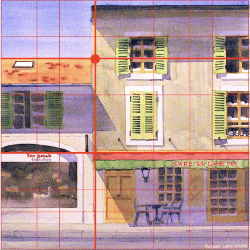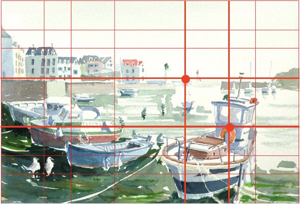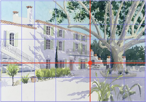Remarquez que si le tracé régulateur est toujours le même, l'aquarelliste n'utilise pas toute les possibilités de la structure pour placer son ou ses centres d'intérêts.
