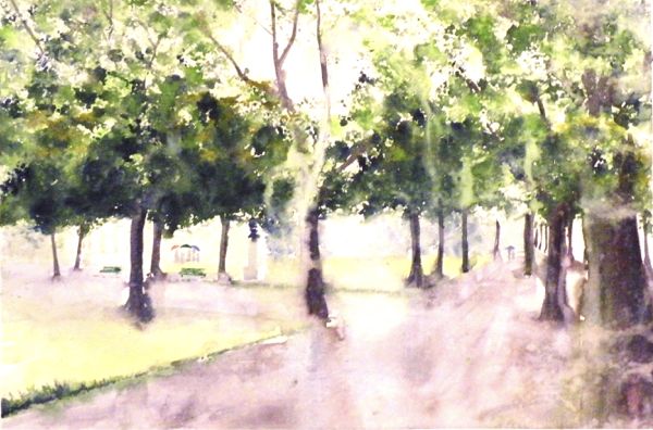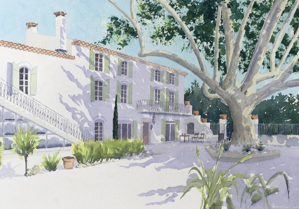 Le centre d'intérêt principal voulu est le petit coin d'ombre ou deux verres et une bouteille attendent le visiteur sur une table située dans l'ombre fraîche du platane.