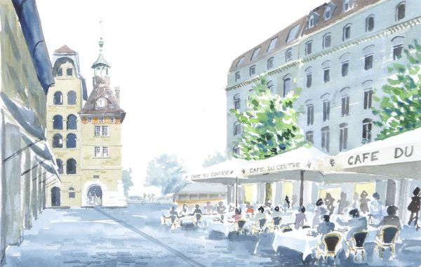 La place du Molard et la tour du Molard à Genève, Suisse.