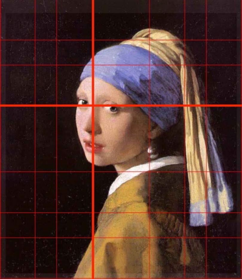 Les lignes rouges sont nommées lignes d'or primaires (gauche, droite haute et basse). Elles résultent de la division des dimensions extérieures du tableau par 1.618, le nombre d'Or.