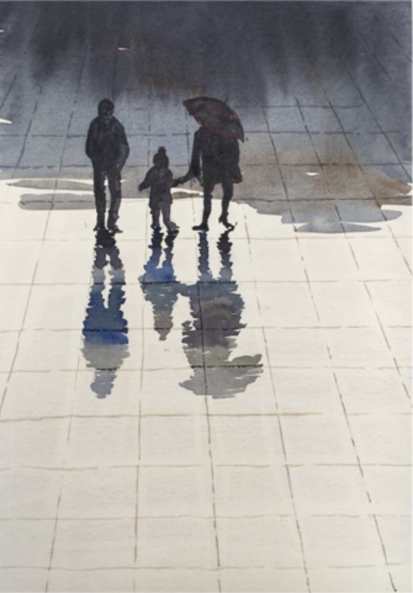 Jeu de reflets sous la pluie (d'après une photo anonyme).