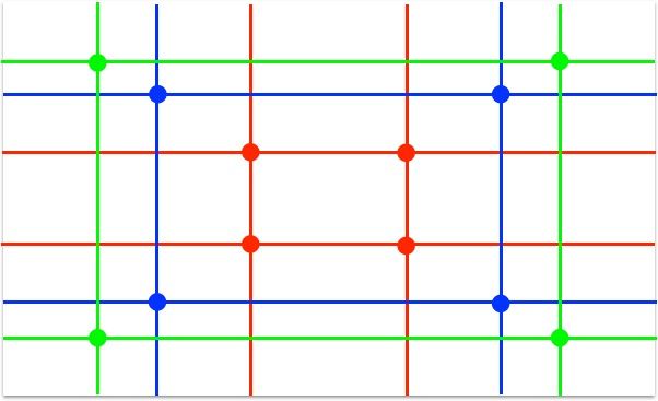 Les lignes bleues sont les lignes d'or secondaires, et les lignes vertes sont les lignes d'or tertiaires.