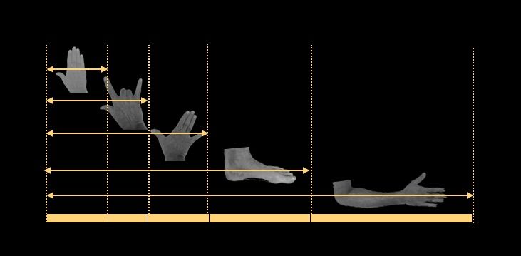 Si l'on additionne la longueur de deux mesures adjacentes, on obtient la troisième : paume + palme = empan, ou empan + pied = coudée.