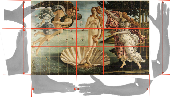 Une grille de carrés réguliers calculée sur cette mesure (qui est peut-être la taille du propre empan de Boticelli !) a été superposée sur le célèbre tableau. Les lignes rouges représentent la division de la hauteur et de la largeur du tableau par le fameux Nombre d'Or.
